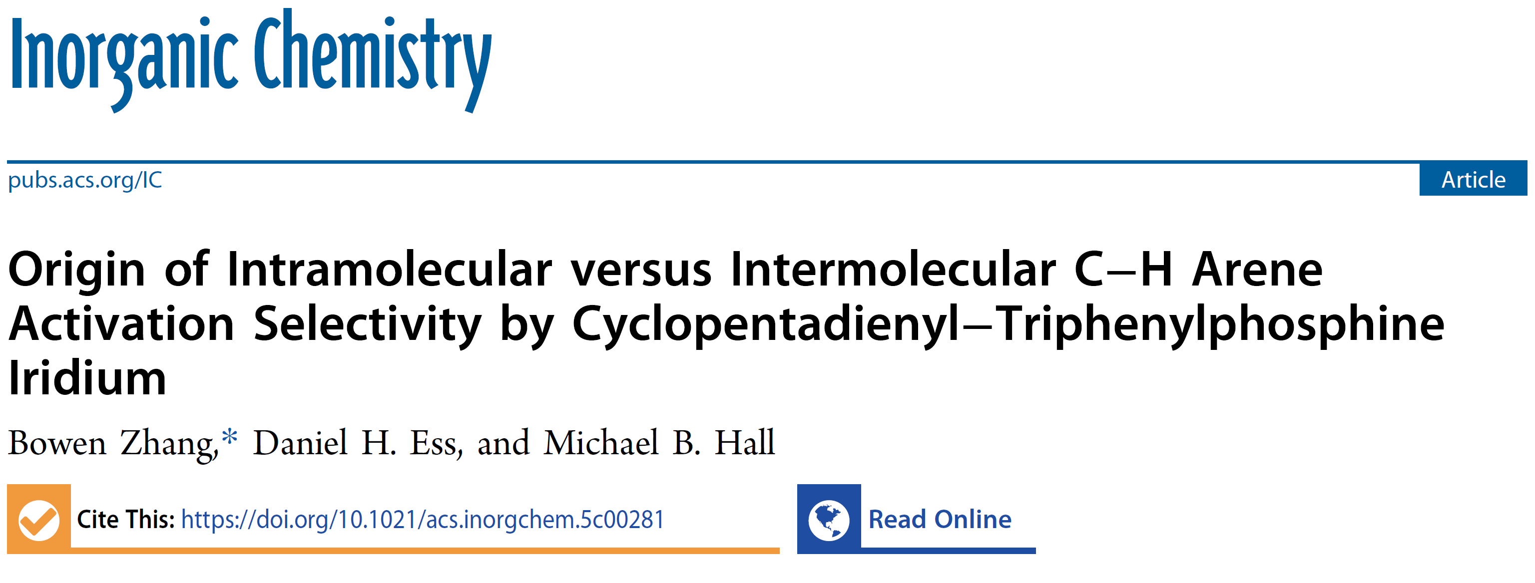 近日,维多利亚vic003张博闻老师在《Inorganic Chemistry》(JCR一区,自然指数期刊)发表题为Origin of Intramolecular versus Intermolecular C−H Arene Activation Selectivity by Cyclopentadienyl−Triphenylphosphine Iridium的最新研究成果。维多利亚vic003张博闻老师为论文第一作者和唯一通讯作者,维多利亚vic003为第一通讯单位。美国杨百翰大学Daniel H. Ess教授和美国德州农工大学Michael B. Hall教授为论文共同作者。