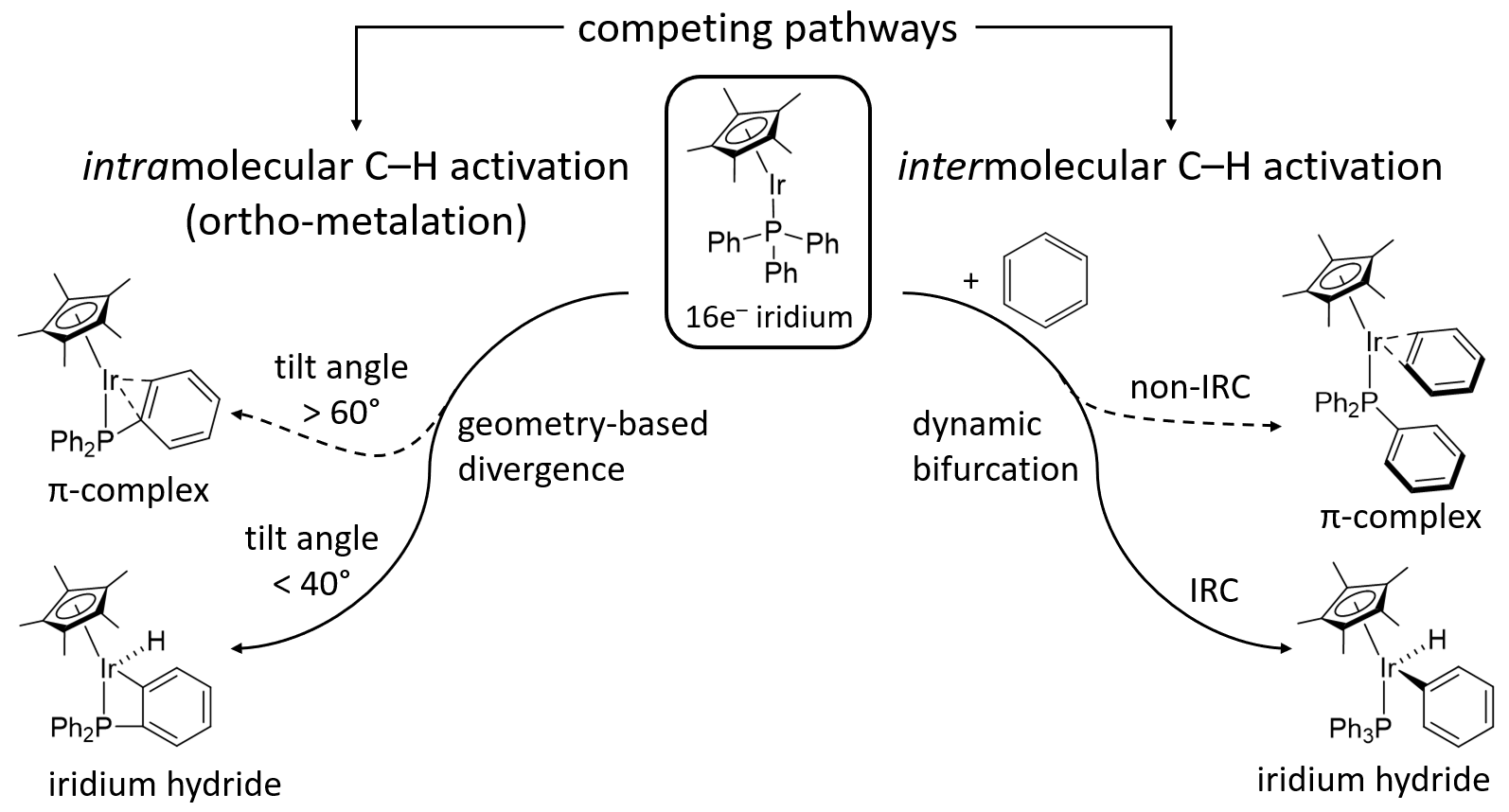 论文中研究的铱配合物在活化苯碳氢键的过程中生成分子间和分子内两种不同的活化产物。然而,静态的密度泛函理论计算结合过渡态理论不能正确解释该反应的选择性。本工作详尽研究了铱配合物的反应势能面,结合直接动力学模拟,阐明了反应的动态机理,揭示了反应选择性的根源,为构建过渡金属配合物碳氢键活化的动力学模型提供了更加深入的见解。